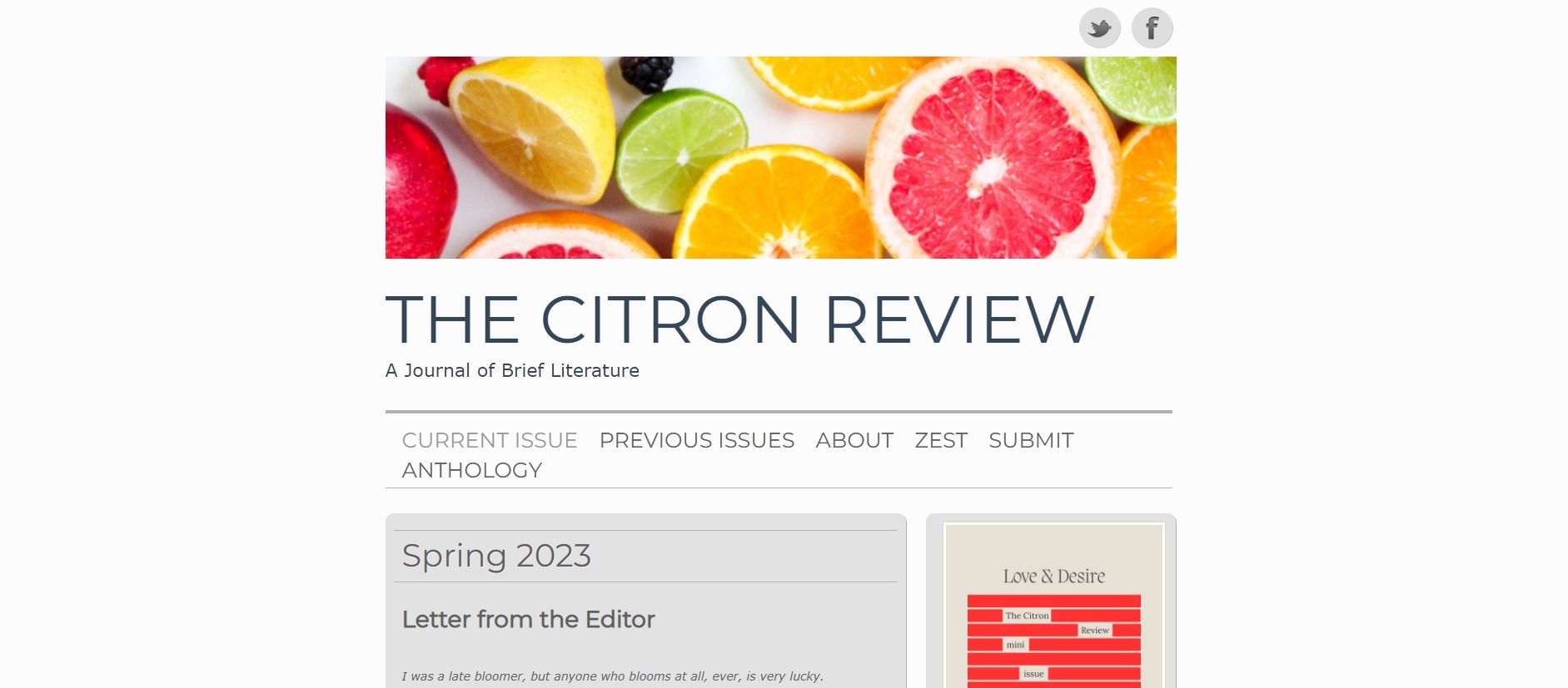 From the site: The Citron Review started back in 2009 when a group of writers decided to create a literary venue that celebrates short literature. These writers had all graduated from the Master of Fine Arts in Creative Writing program at Antioch University in Los Angeles, where they were collectively known as The Citrons. So they named the journal The Citron Review.